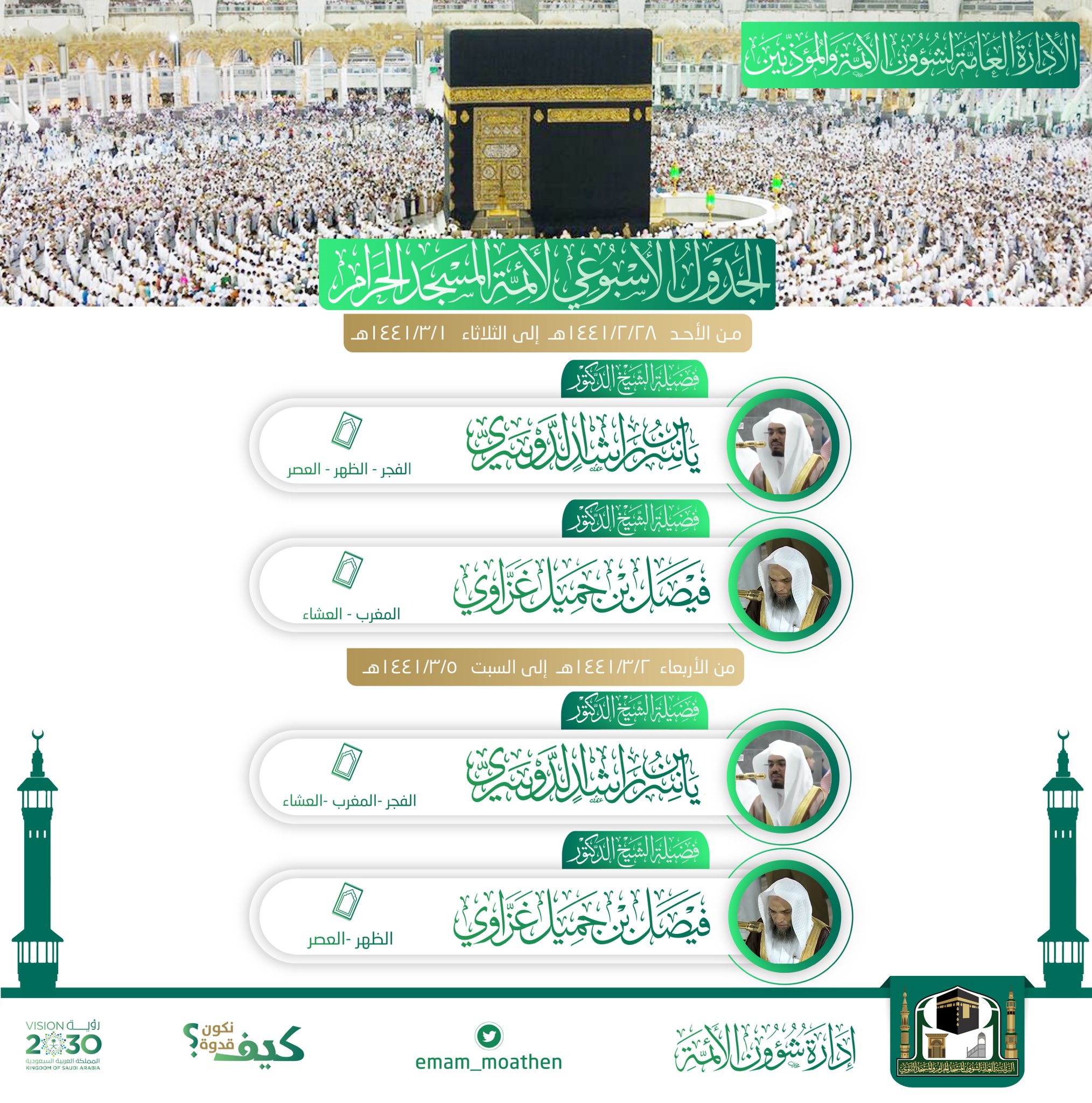 شؤون الأئمة والمؤذنين On Twitter الجدول الأسبوعي لإمامة الفروض بالمسجد الحرام من يوم الأحد 28 صفر 1441 هـ إلى يوم السبت 5 ربيع الأول 1441 هـ فيصل غزاوي ياسر الدوسري إدارة شؤون الأئمة الإدارة العامة لشؤون الأئمةوالمؤذنين Https T Co Hhagbsk1ax