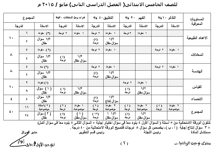 Adz4u Omniawagdy ننشر جدول مواصفات الورقة الامتحانية للرياضيات لجميع صفوف المرحلة الابتدائية للفصل الدراسى الثانى 2015