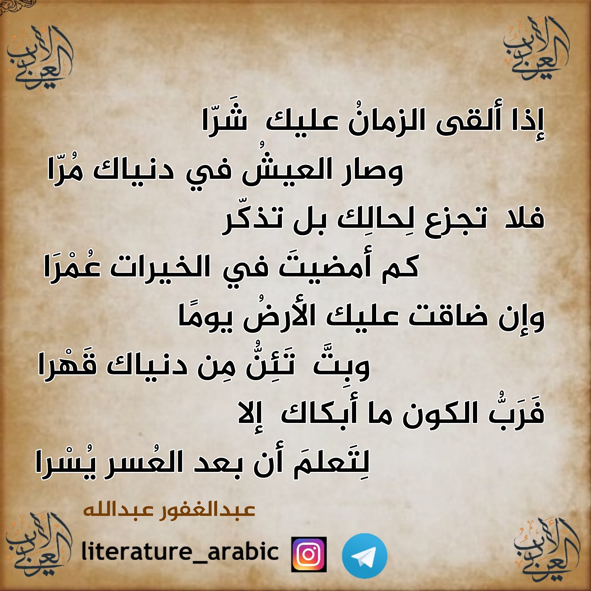 صباحيات أدبية Pa Twitter إذا ألقى الزمان عليك ش ر ا وصار العيش في دنياك م ر ا فلا تجزع ل حال ك بل تذك ر كم أمضيت في الخيرات ع م ر ا وإن ضاقت عليك الأرض يوم ا وب ت ت ئ ن م ن دنياك