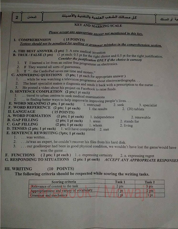 تصحيح الإمتحان الوطني للبكالوريا مادة اللغة الإنجليزية الشعب العلمية الدورة العادية 2016