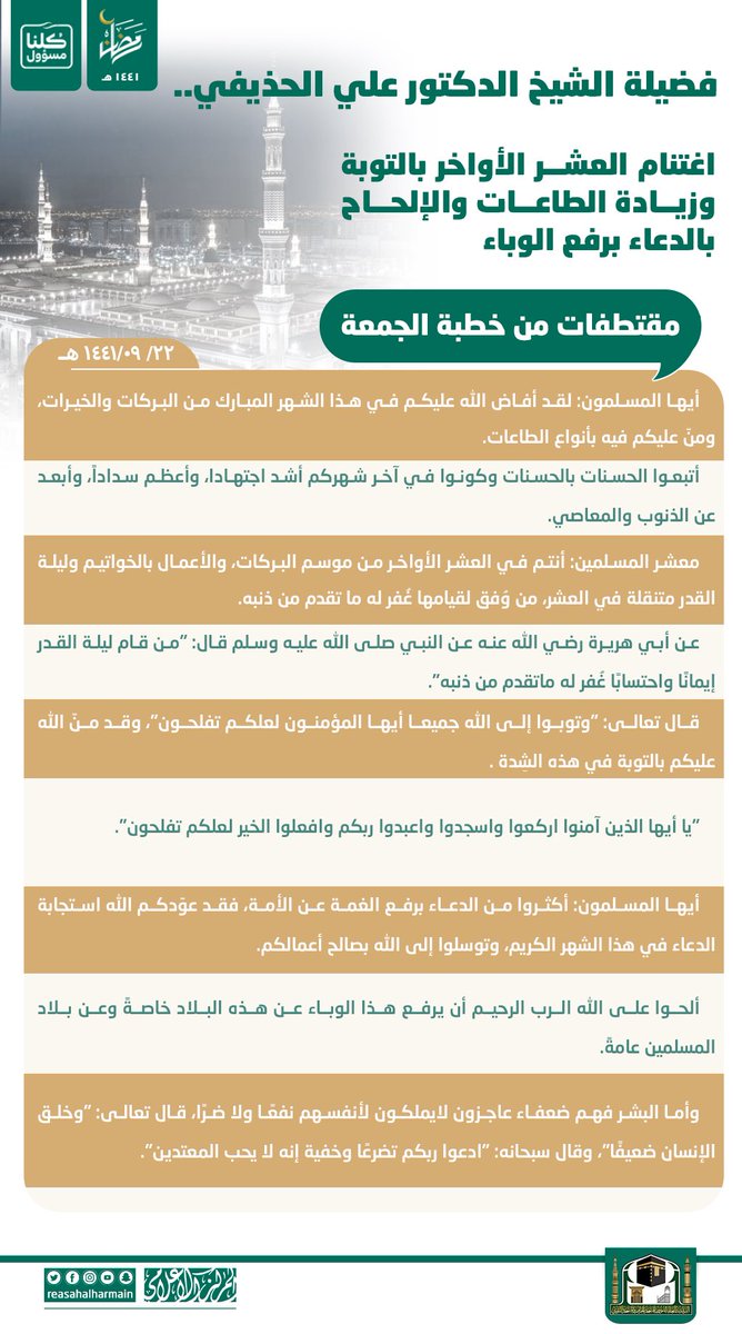 رئاسة شؤون الحرمين على تويتر مقتطفات من خطبة الجمعة بـ المسجد النبوي لفضيلة الشيخ الدكتور علي الحذيفي رمضان الجمعة