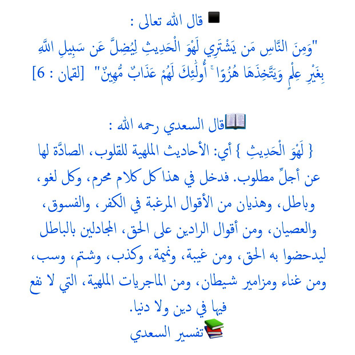 تفسير السعدي On Twitter ومن الناس من يشتري لهو الحديث ليضل عن سبيل الله بغير علم ويتخذها هزوا أولئك لهم عذاب مهين